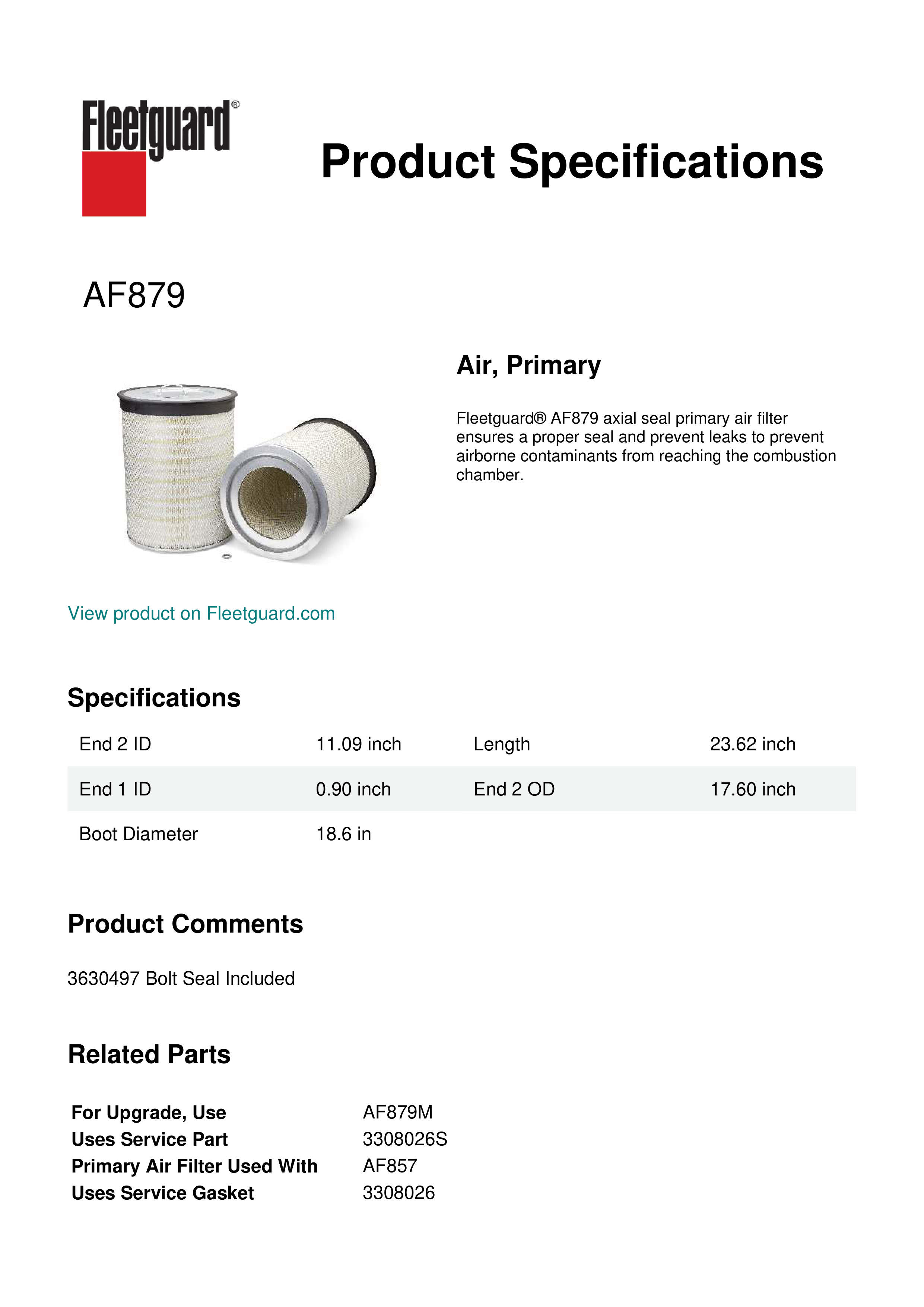 Fleetguard® AF879 axial seal primary air filter ensures a proper seal and prevent leaks to prevent airborne contaminants from reaching the combustion chamber.