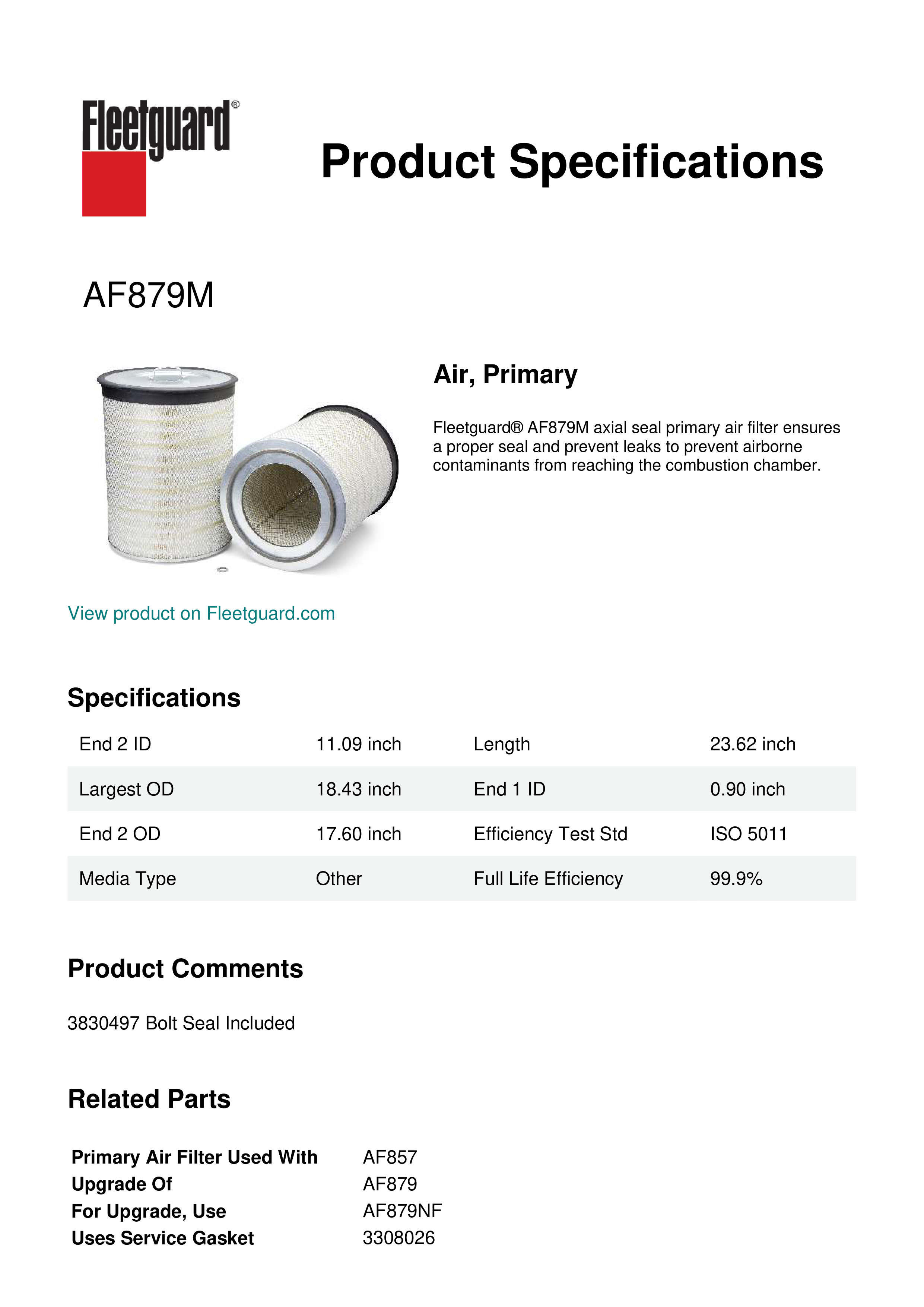 Fleetguard® AF879M axial seal primary air filter ensures a proper seal and prevent leaks to prevent airborne contaminants from reaching the combustion chamber.Specification