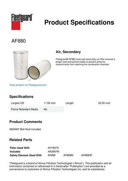Fleetguard® AF880 axial seal secondary air filter ensures a proper seal and prevent leaks to prevent airborne contaminants from reaching the combustion chamber.Specification