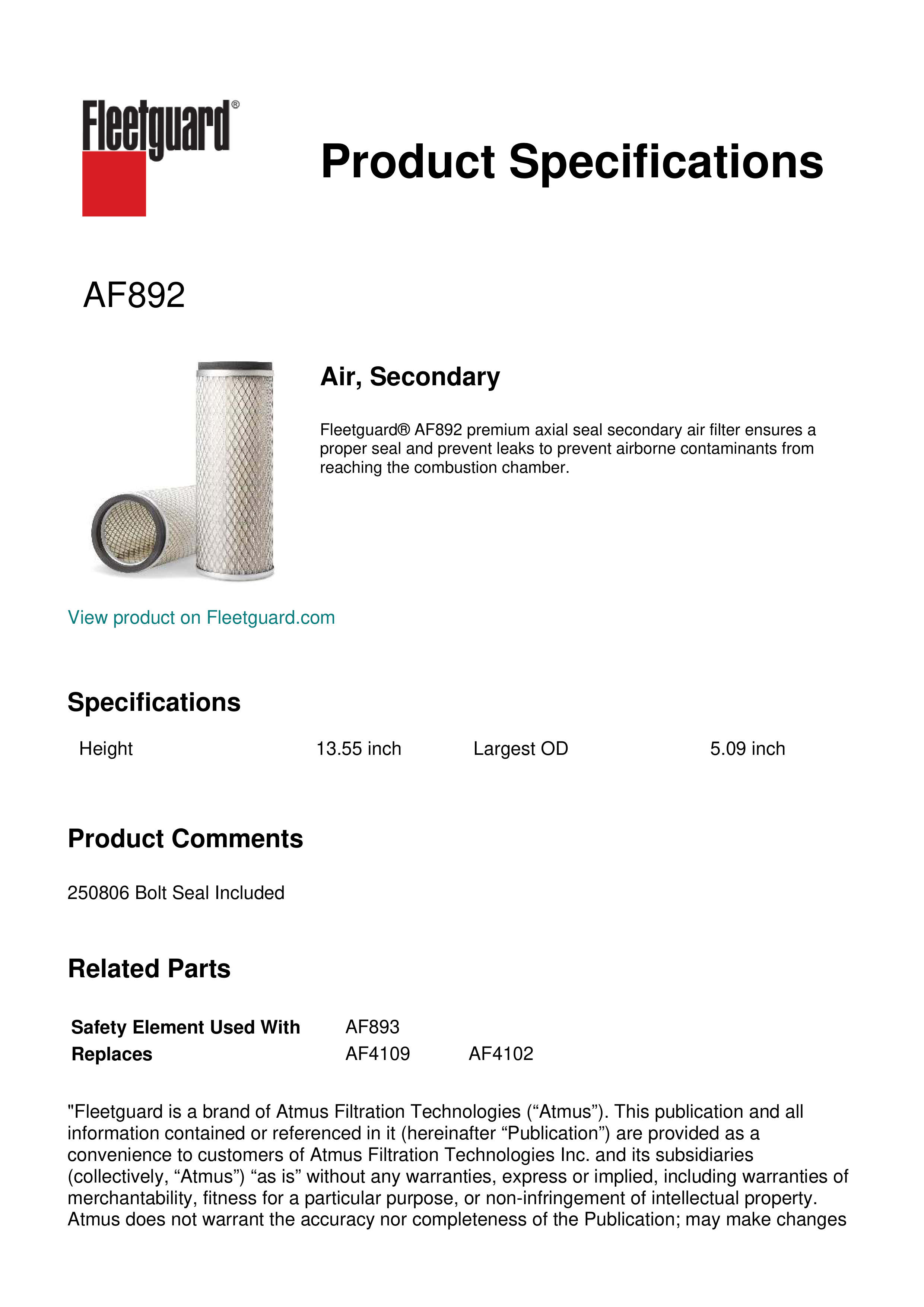 Fleetguard® AF892 premium axial seal secondary air filter ensures a proper seal and prevent leaks to prevent airborne contaminants from reaching the combustion chamber.Specification