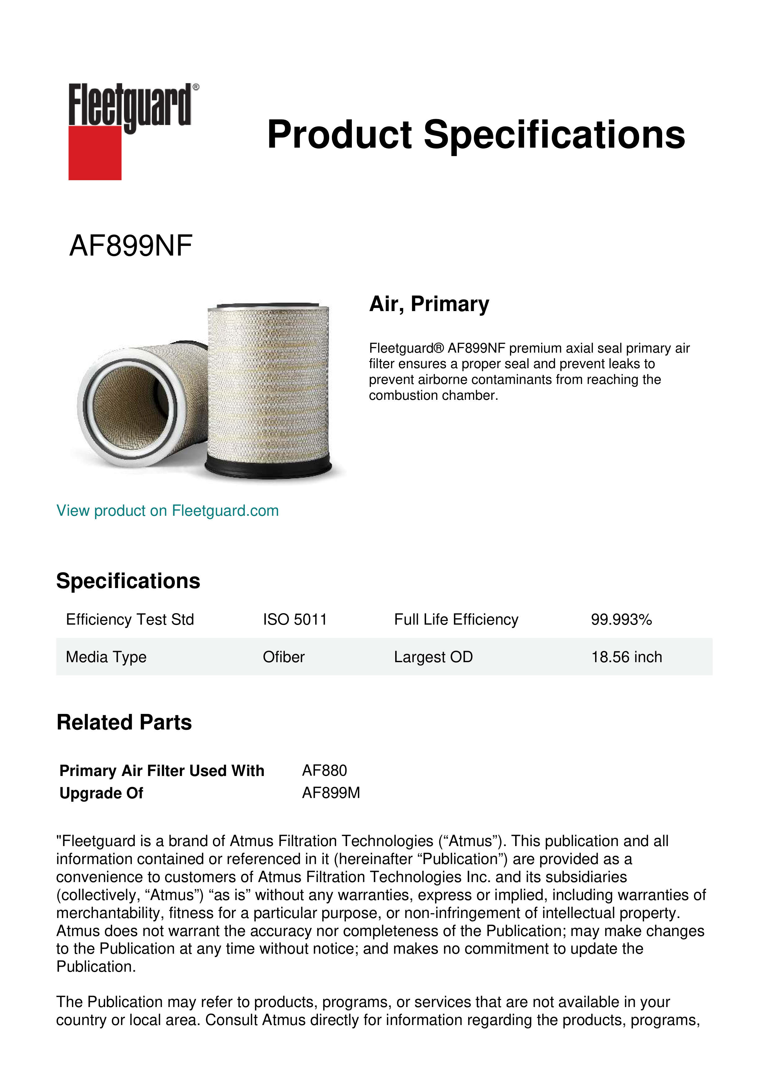 Fleetguard® AF899NF premium axial seal primary air filter ensures a proper seal and prevent leaks to prevent airborne contaminants from reaching the combustion chamber.Specification