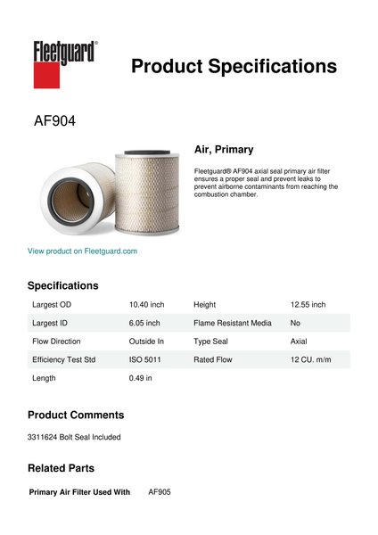Fleetguard® AF904 axial seal primary air filter ensures a proper seal and prevent leaks to prevent airborne contaminants from reaching the combustion chamber.