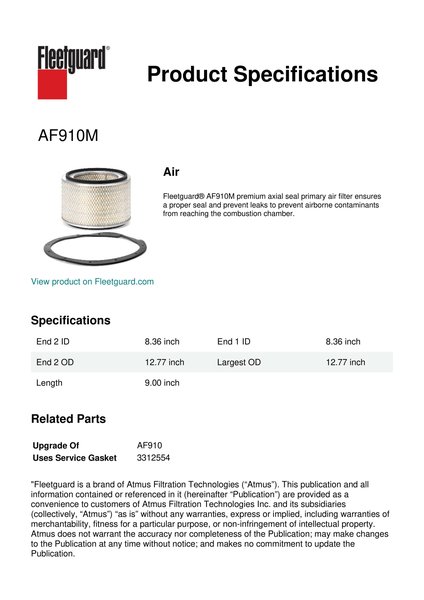 Fleetguard® AF910M premium axial seal primary air filter ensures a proper seal and prevent leaks to prevent airborne contaminants from reaching the combustion chamber.