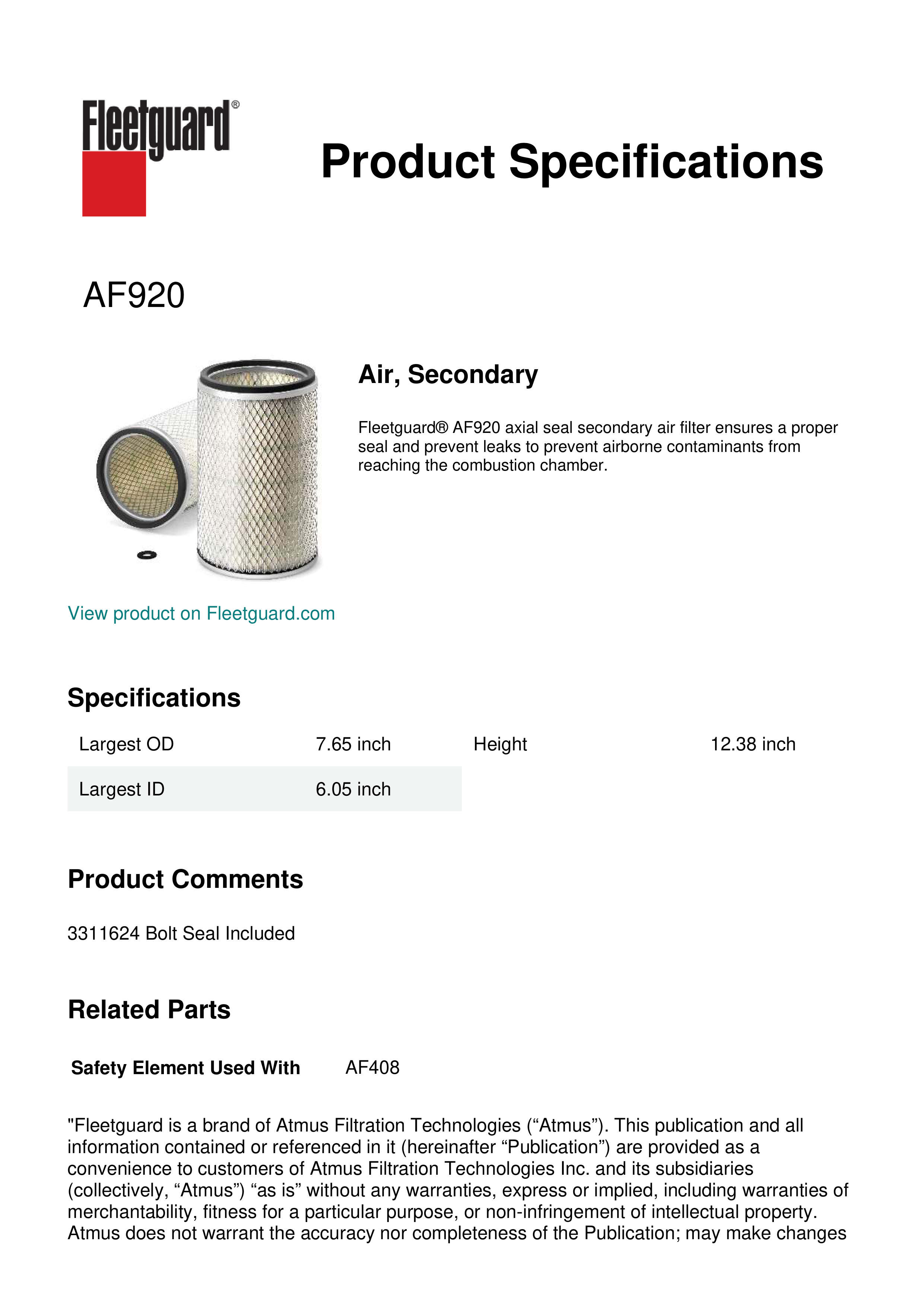 Fleetguard® AF920 axial seal secondary air filter ensures a proper seal and prevent leaks to prevent airborne contaminants from reaching the combustion chamber.Specification