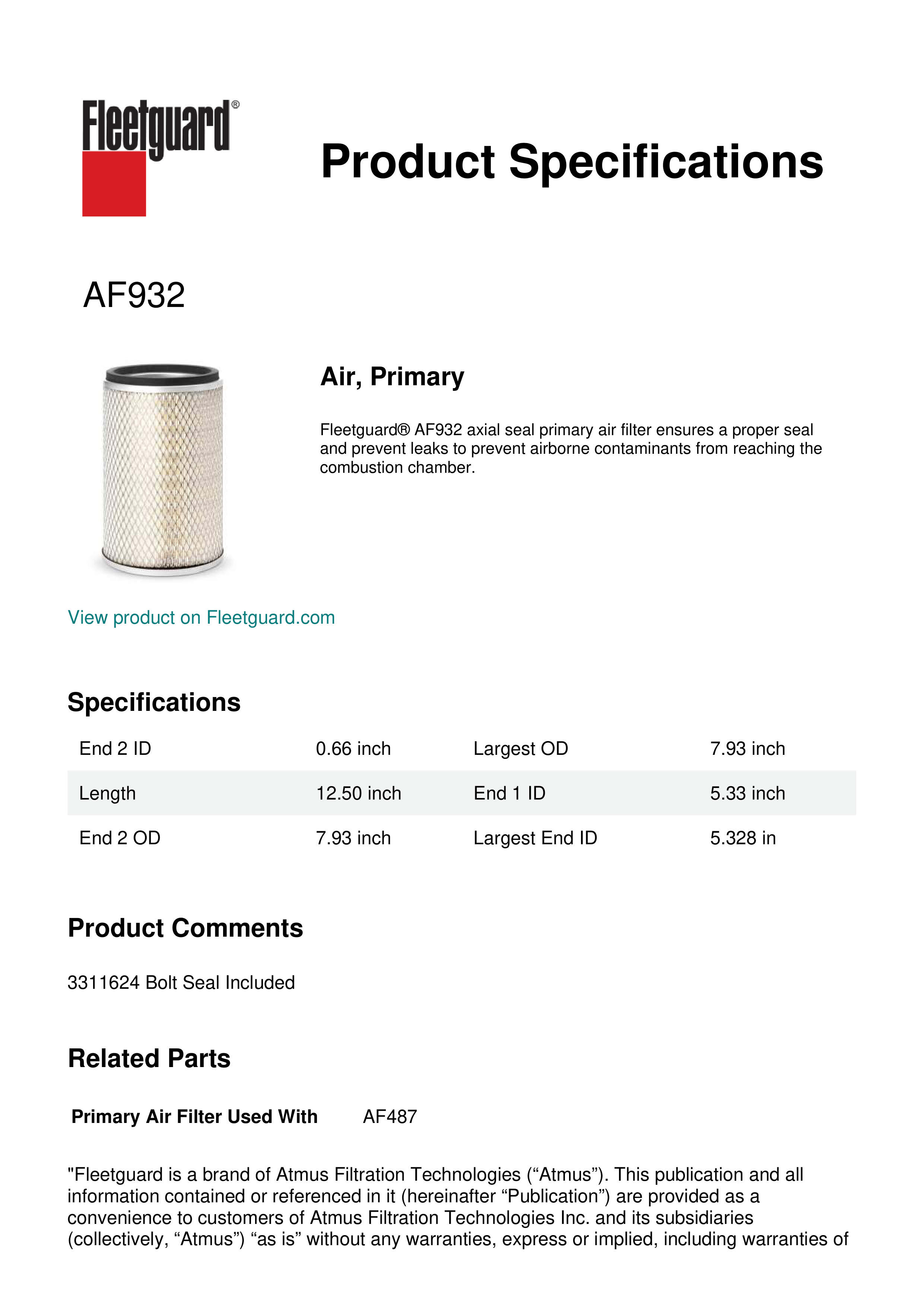 Fleetguard® AF932 axial seal primary air filter ensures a proper seal and prevent leaks to prevent airborne contaminants from reaching the combustion chamber.