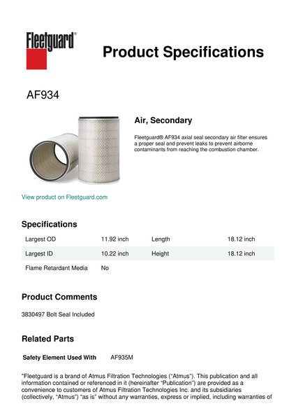 Fleetguard® AF934 axial seal secondary air filter ensures a proper seal and prevent leaks to prevent airborne contaminants from reaching the combustion chamber.