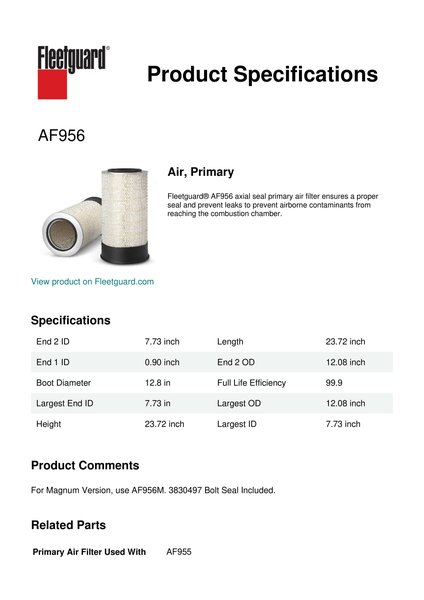 Fleetguard® AF956 axial seal primary air filter ensures a proper seal and prevent leaks to prevent airborne contaminants from reaching the combustion chamber.