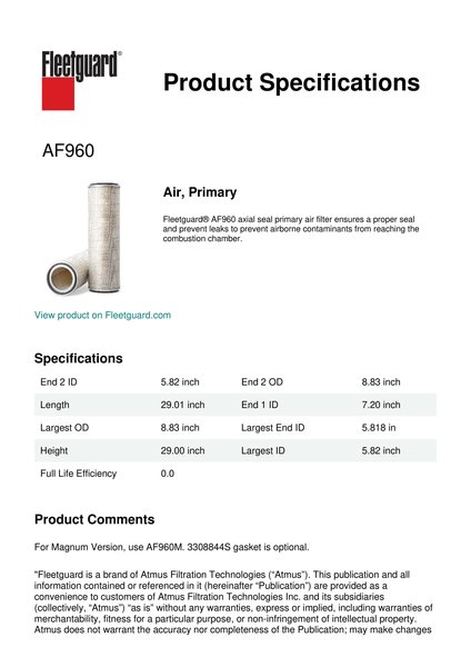 Fleetguard® AF960 axial seal primary air filter ensures a proper seal and prevent leaks to prevent airborne contaminants from reaching the combustion chamber.Specification