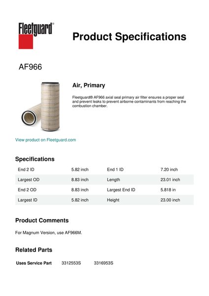 Fleetguard® AF966 axial seal primary air filter ensures a proper seal and prevent leaks to prevent airborne contaminants from reaching the combustion chamber.Specification