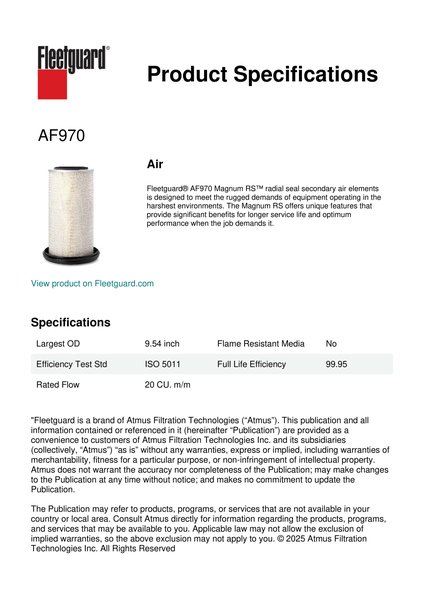 Fleetguard® AF970 Magnum RS™ radial seal secondary air elements is designed to meet the rugged demands of equipment operating in the harshest environments. The Magnum RS offers unique features that provide significant benefits for longer service life and optimum performance when the job demands it.Specification