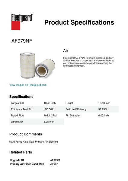 Fleetguard® AF979NF premium axial seal primary air filter ensures a proper seal and prevent leaks to prevent airborne contaminants from reaching the combustion chamber.Specification