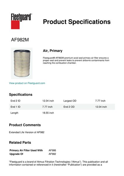 Fleetguard® AF982M premium axial seal primary air filter ensures a proper seal and prevent leaks to prevent airborne contaminants from reaching the combustion chamber.