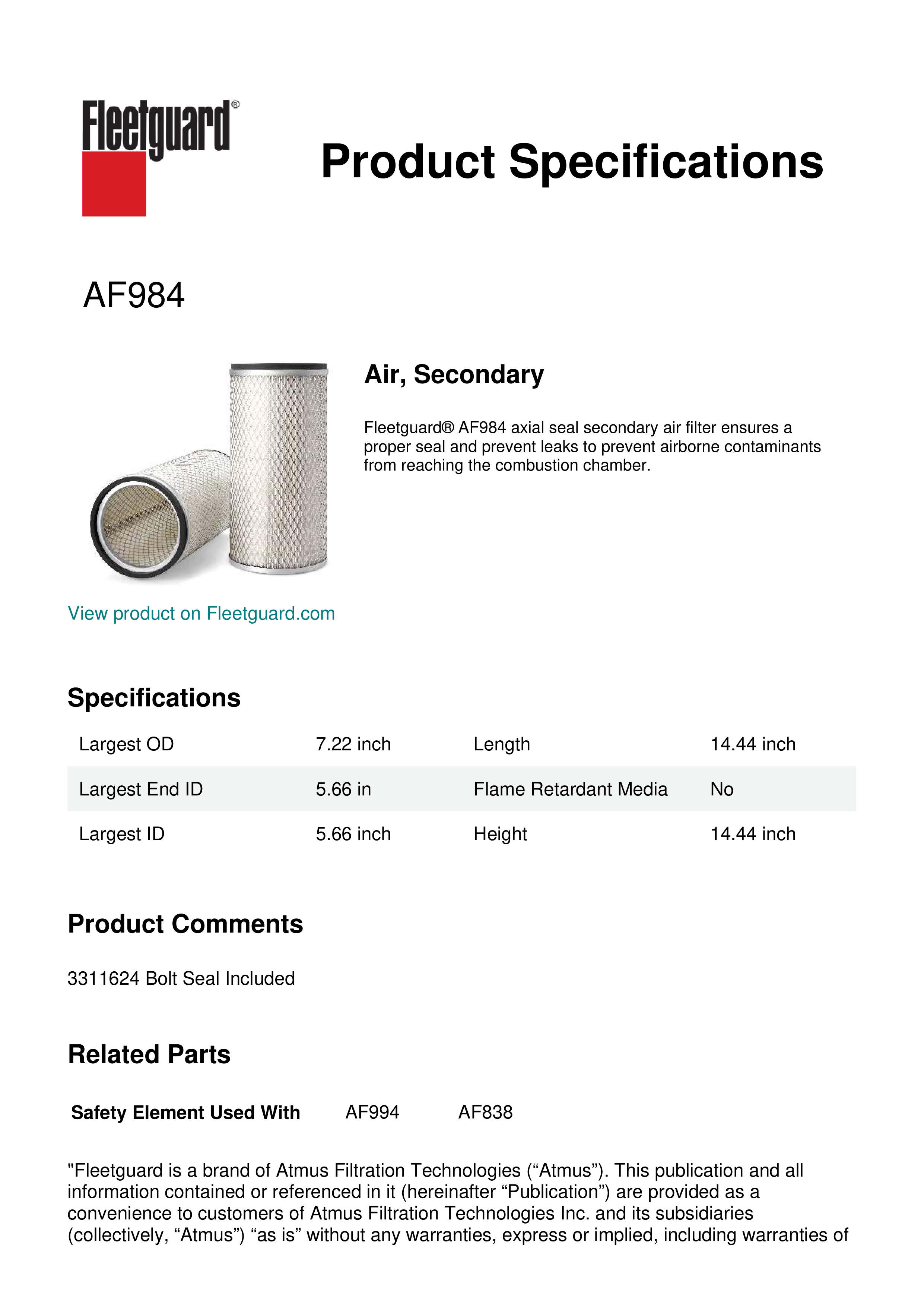 Fleetguard® AF984 axial seal secondary air filter ensures a proper seal and prevent leaks to prevent airborne contaminants from reaching the combustion chamber.Specification