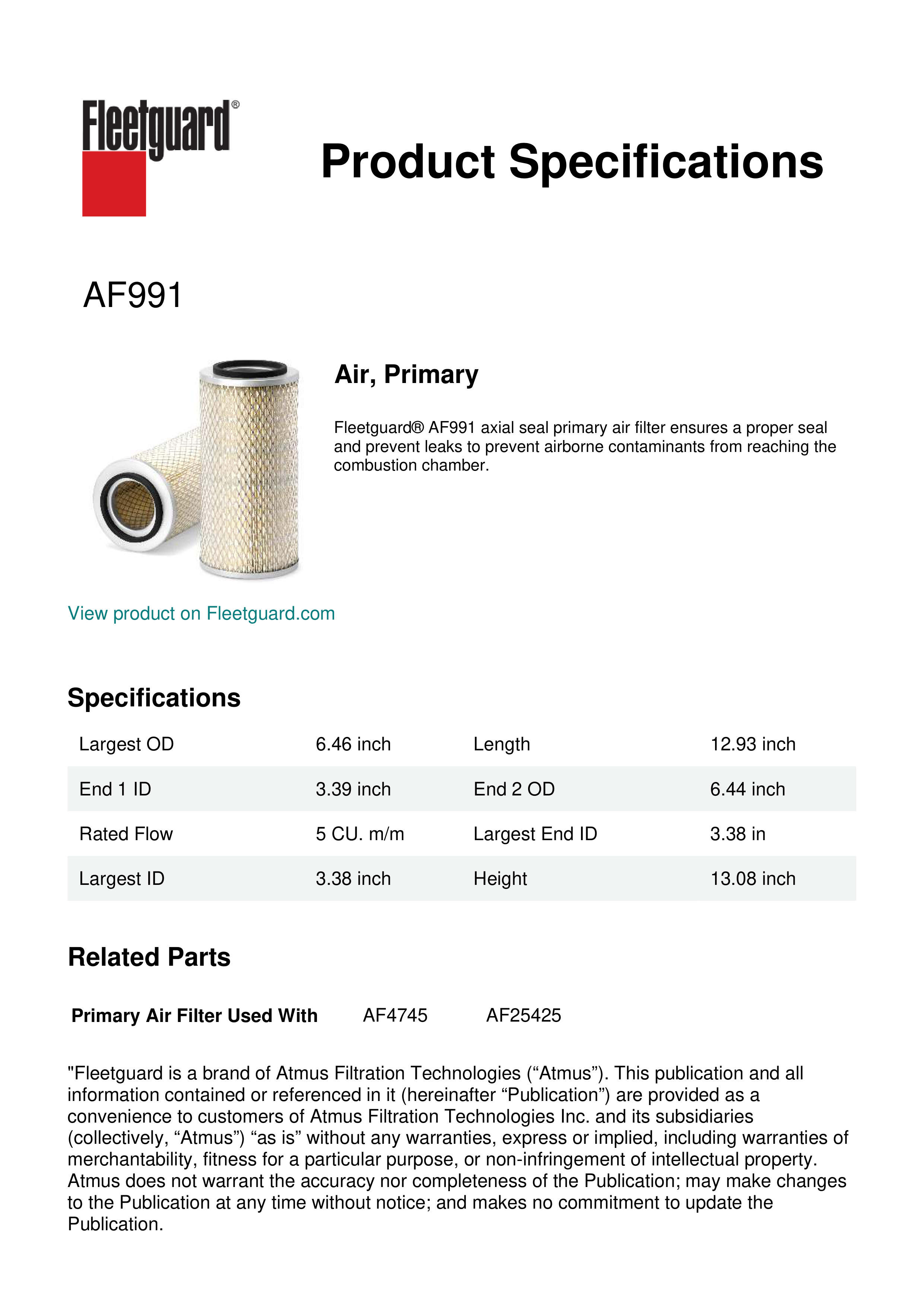 Fleetguard® AF991 axial seal primary air filter ensures a proper seal and prevent leaks to prevent airborne contaminants from reaching the combustion chamber.Specification