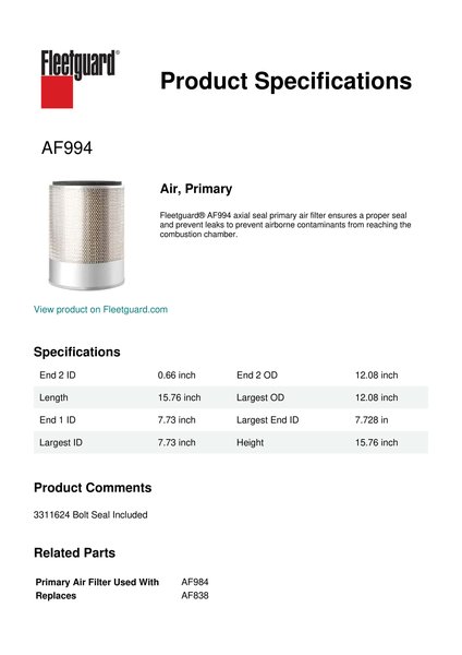 Fleetguard® AF994 axial seal primary air filter ensures a proper seal and prevent leaks to prevent airborne contaminants from reaching the combustion chamber.