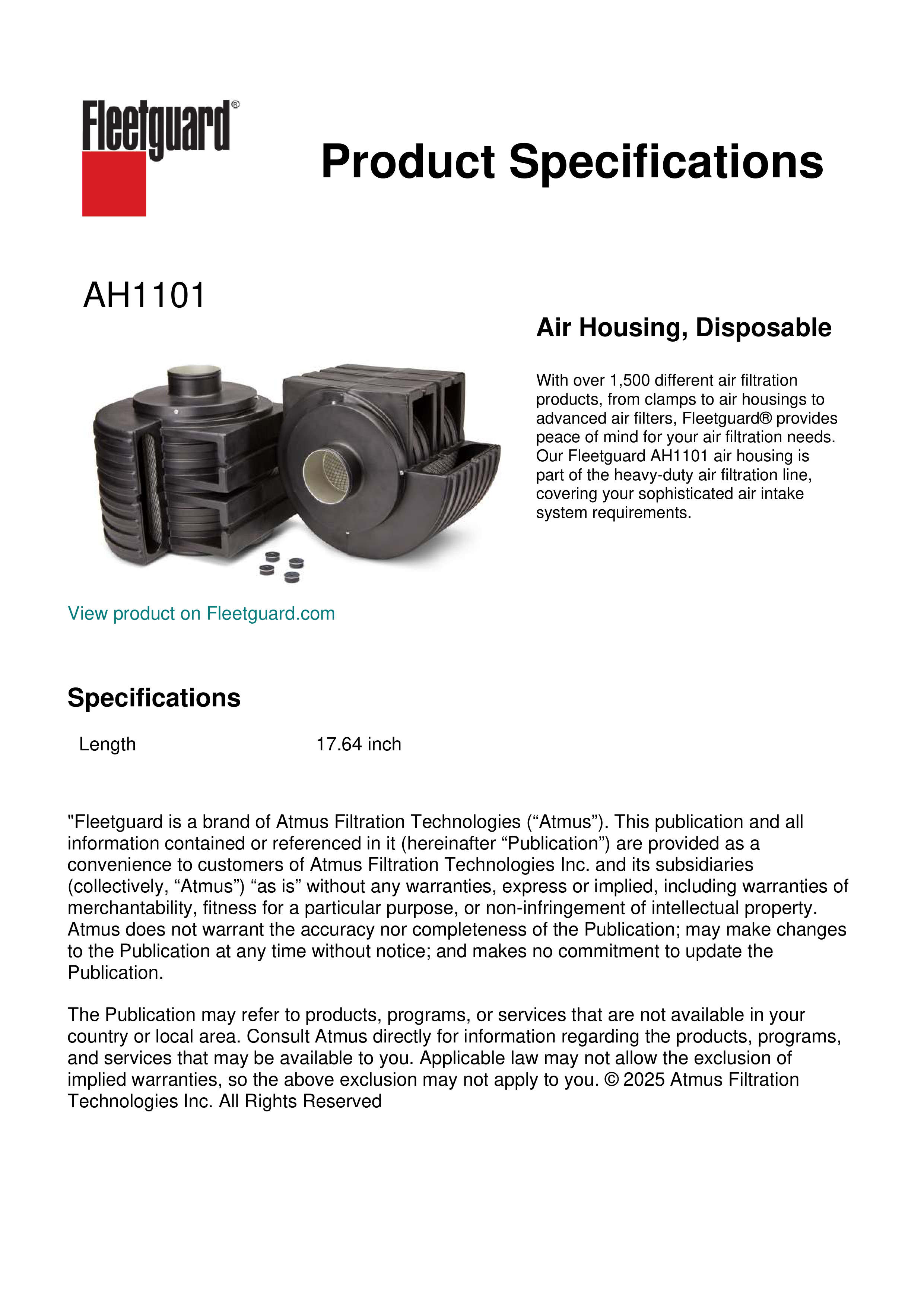 With over 1,500 different air filtration products, from clamps to air housings to advanced air filters, Fleetguard® provides peace of mind for your air filtration needs. Our Fleetguard AH1101 air housing is part of the heavy-duty air filtration line, covering your sophisticated air intake system requirements.Specification