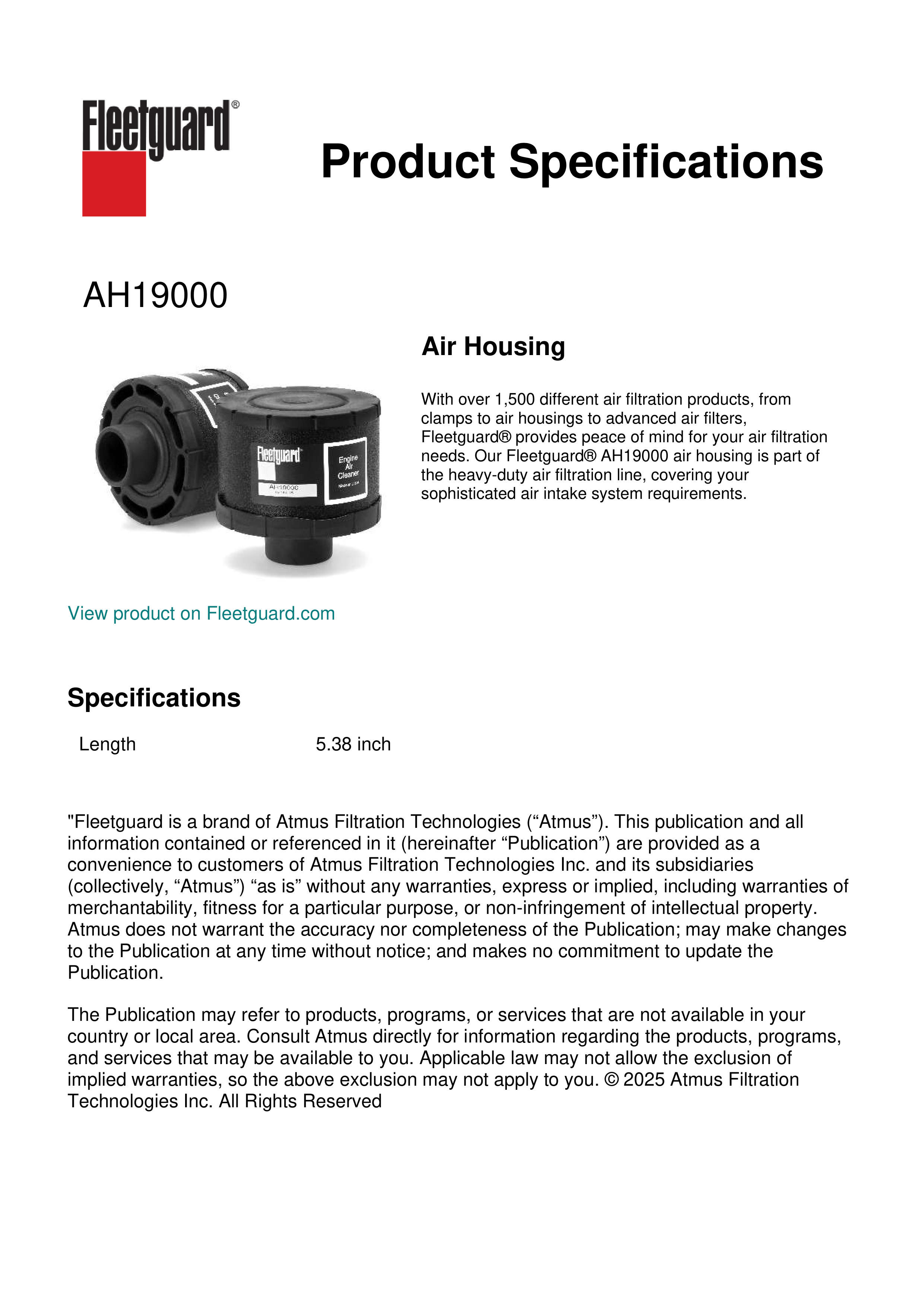 With over 1,500 different air filtration products, from clamps to air housings to advanced air filters, Fleetguard® provides peace of mind for your air filtration needs. Our Fleetguard® AH19000 air housing is part of the heavy-duty air filtration line, covering your sophisticated air intake system requirements.Specification