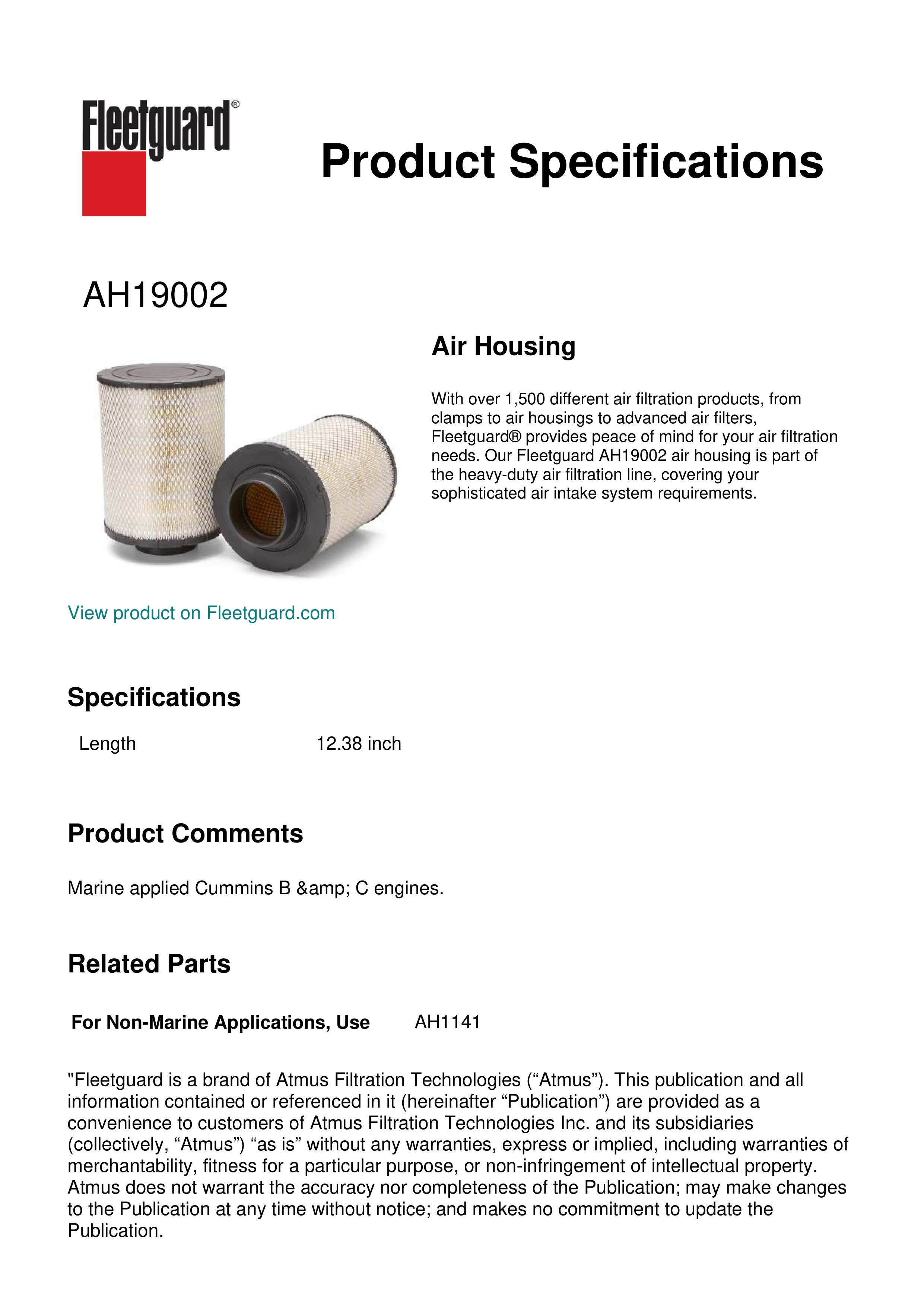 With over 1,500 different air filtration products, from clamps to air housings to advanced air filters, Fleetguard® provides peace of mind for your air filtration needs. Our Fleetguard AH19002 air housing is part of the heavy-duty air filtration line, covering your sophisticated air intake system requirements.Specification