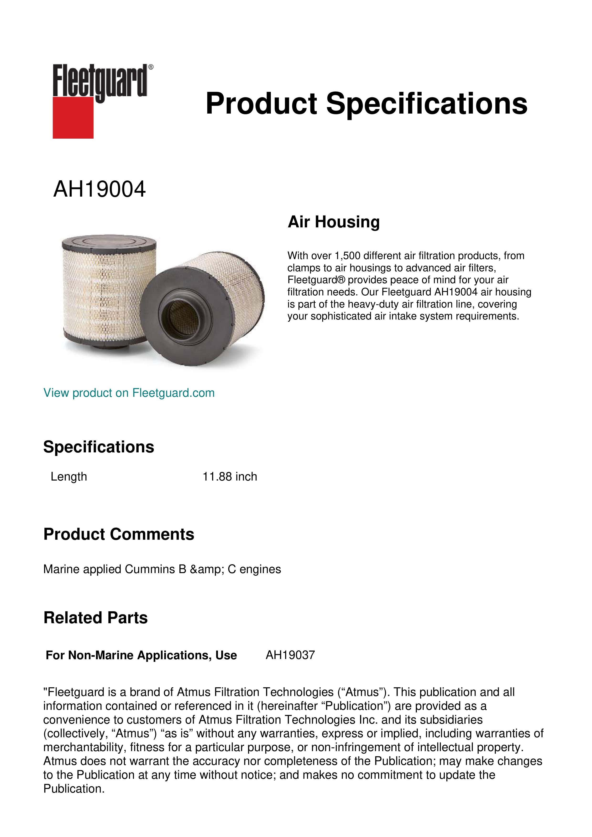 With over 1,500 different air filtration products, from clamps to air housings to advanced air filters, Fleetguard® provides peace of mind for your air filtration needs. Our Fleetguard AH19004 air housing is part of the heavy-duty air filtration line, covering your sophisticated air intake system requirements.Specification