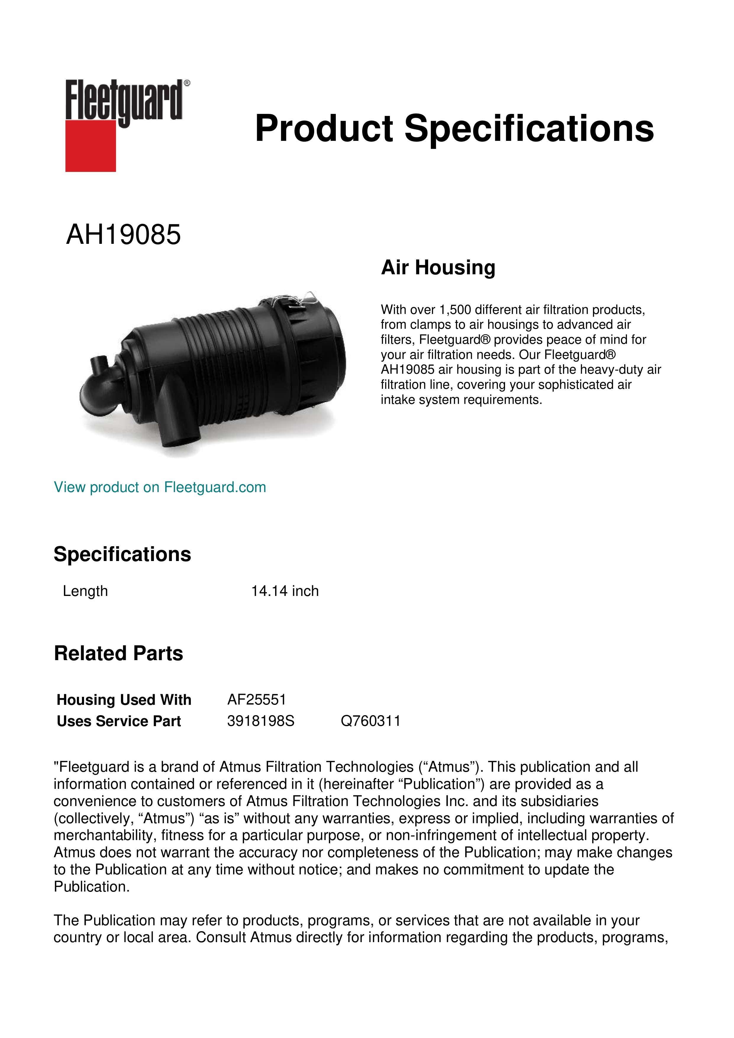 With over 1,500 different air filtration products, from clamps to air housings to advanced air filters, Fleetguard® provides peace of mind for your air filtration needs. Our Fleetguard® AH19085 air housing is part of the heavy-duty air filtration line, covering your sophisticated air intake system requirements.Specification