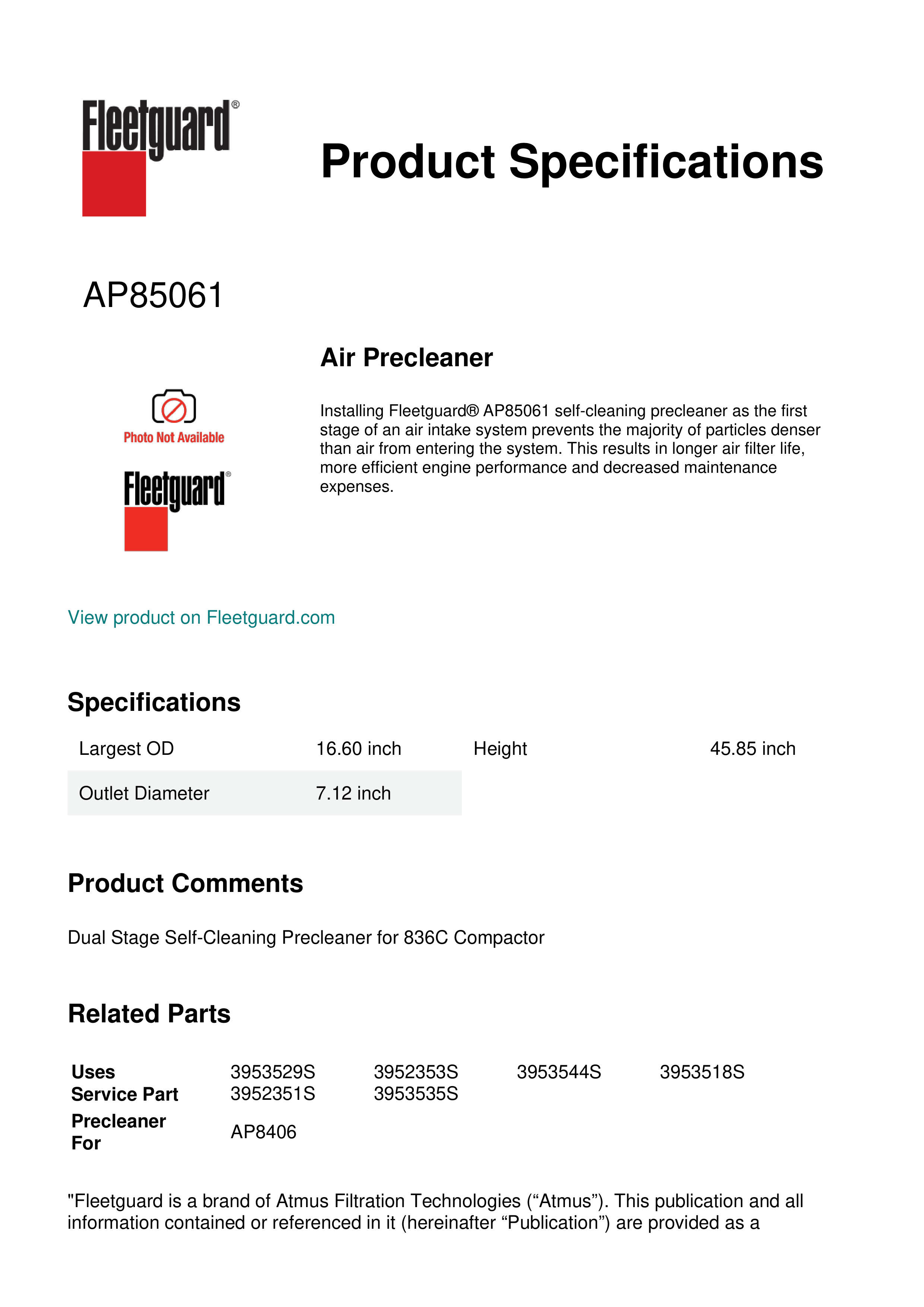 Installing Fleetguard® AP85061 self-cleaning precleaner as the first stage of an air intake system prevents the majority of particles denser than air from entering the system. This results in longer air filter life, more efficient engine performance and decreased maintenance expenses.Specification