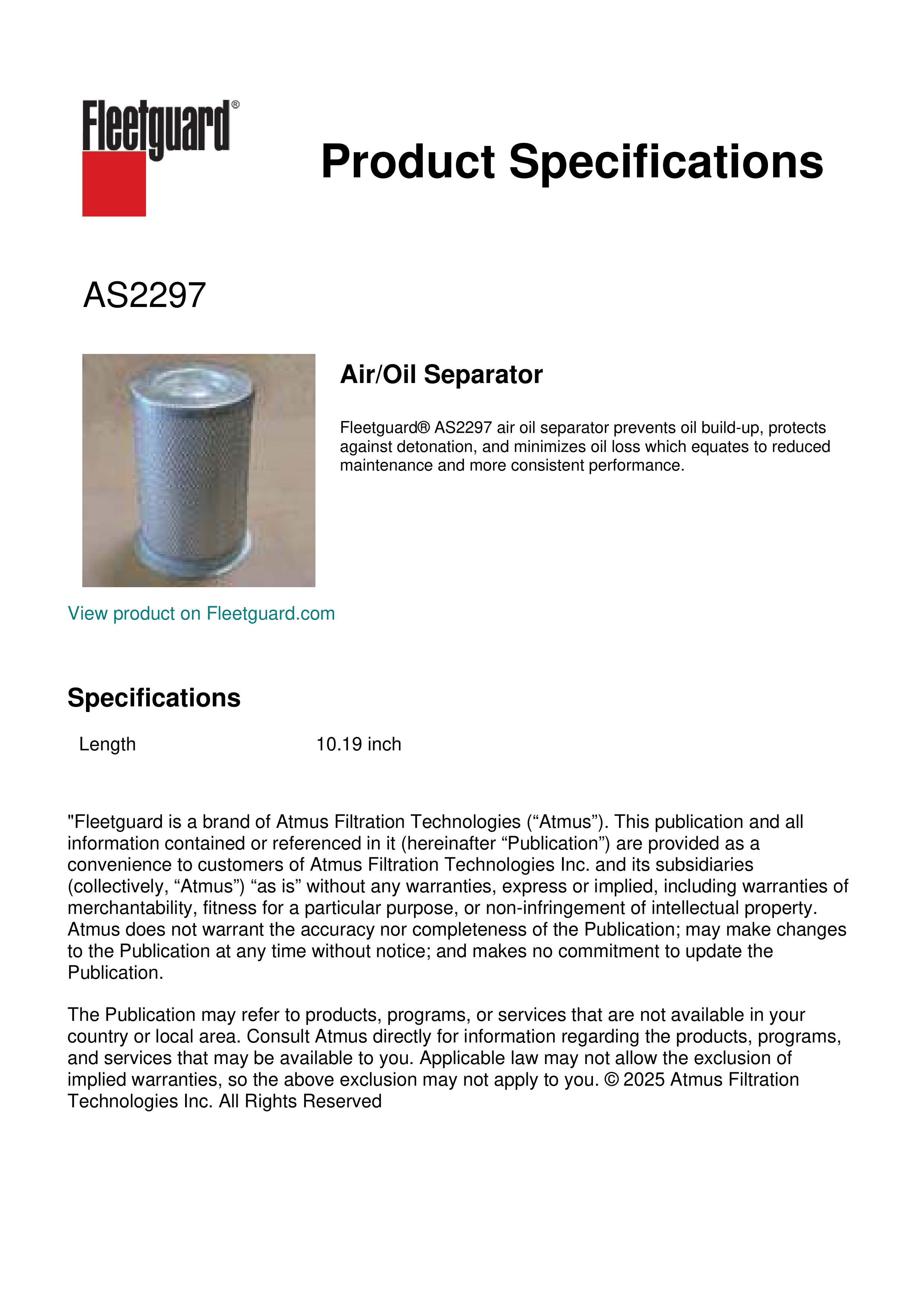 Fleetguard® AS2297 air oil separator prevents oil build-up, protects against detonation, and minimizes oil loss which equates to reduced maintenance and more consistent performance.Specification