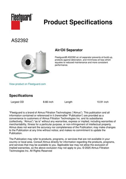 Fleetguard® AS2392 air oil separator prevents oil build-up, protects against detonation, and minimizes oil loss which equates to reduced maintenance and more consistent performance.Specification