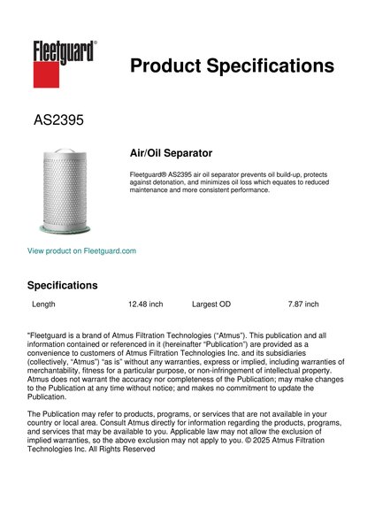 Fleetguard® AS2395 air oil separator prevents oil build-up, protects against detonation, and minimizes oil loss which equates to reduced maintenance and more consistent performance.Specification