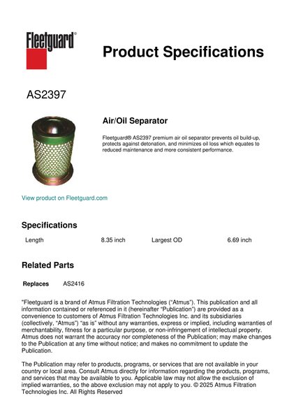 Fleetguard® AS2397 premium air oil separator prevents oil build-up, protects against detonation, and minimizes oil loss which equates to reduced maintenance and more consistent performance.Specification