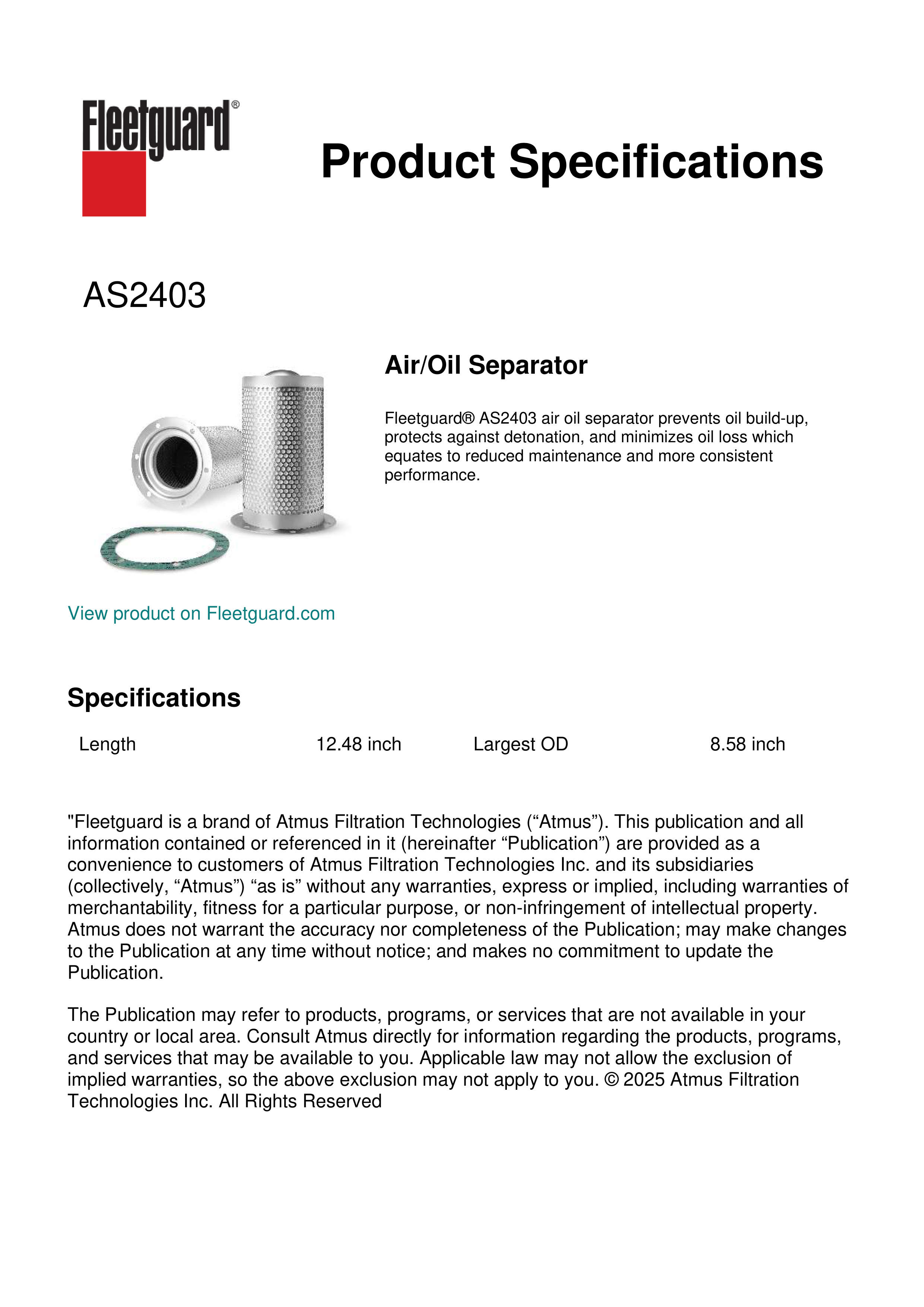 Fleetguard® AS2403 air oil separator prevents oil build-up, protects against detonation, and minimizes oil loss which equates to reduced maintenance and more consistent performance.Specification