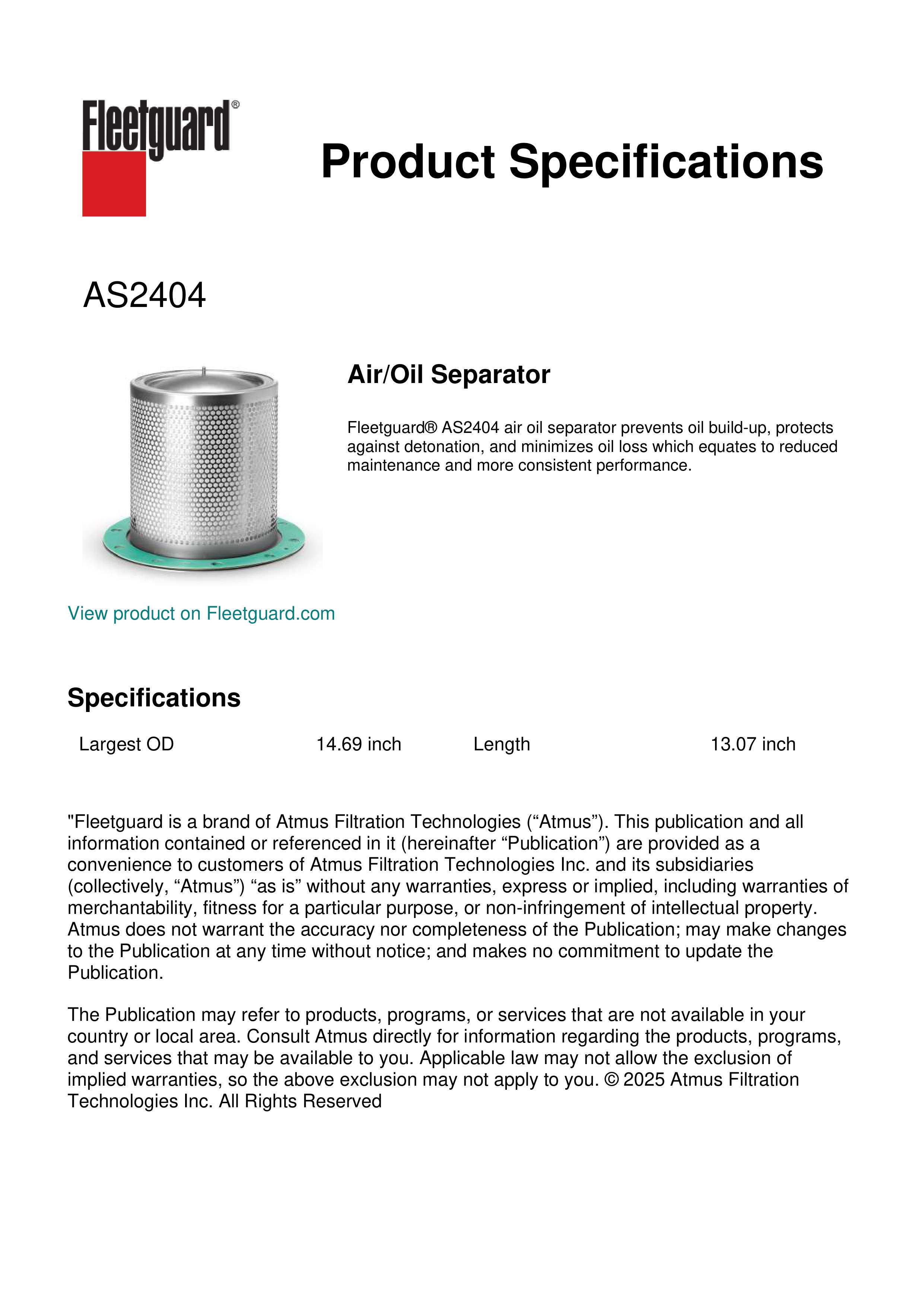Fleetguard® AS2404 air oil separator prevents oil build-up, protects against detonation, and minimizes oil loss which equates to reduced maintenance and more consistent performance.Specification