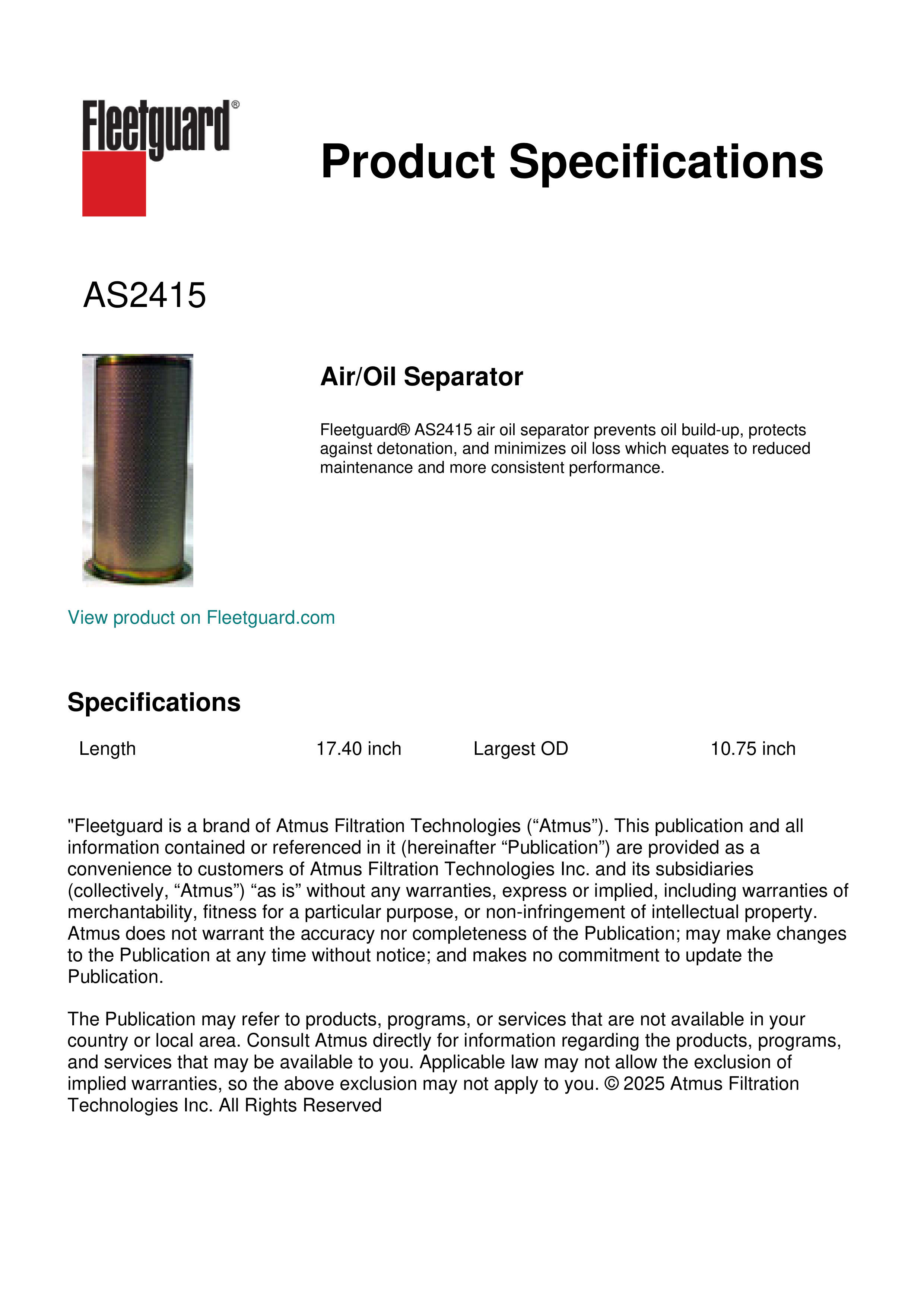 Fleetguard® AS2415 air oil separator prevents oil build-up, protects against detonation, and minimizes oil loss which equates to reduced maintenance and more consistent performance.Specification