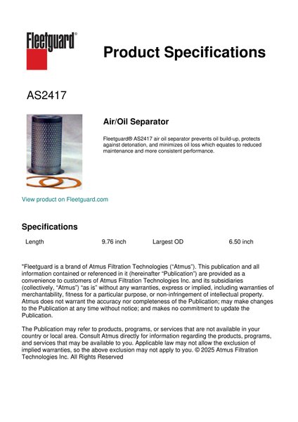 Fleetguard® AS2417 air oil separator prevents oil build-up, protects against detonation, and minimizes oil loss which equates to reduced maintenance and more consistent performance.Specification