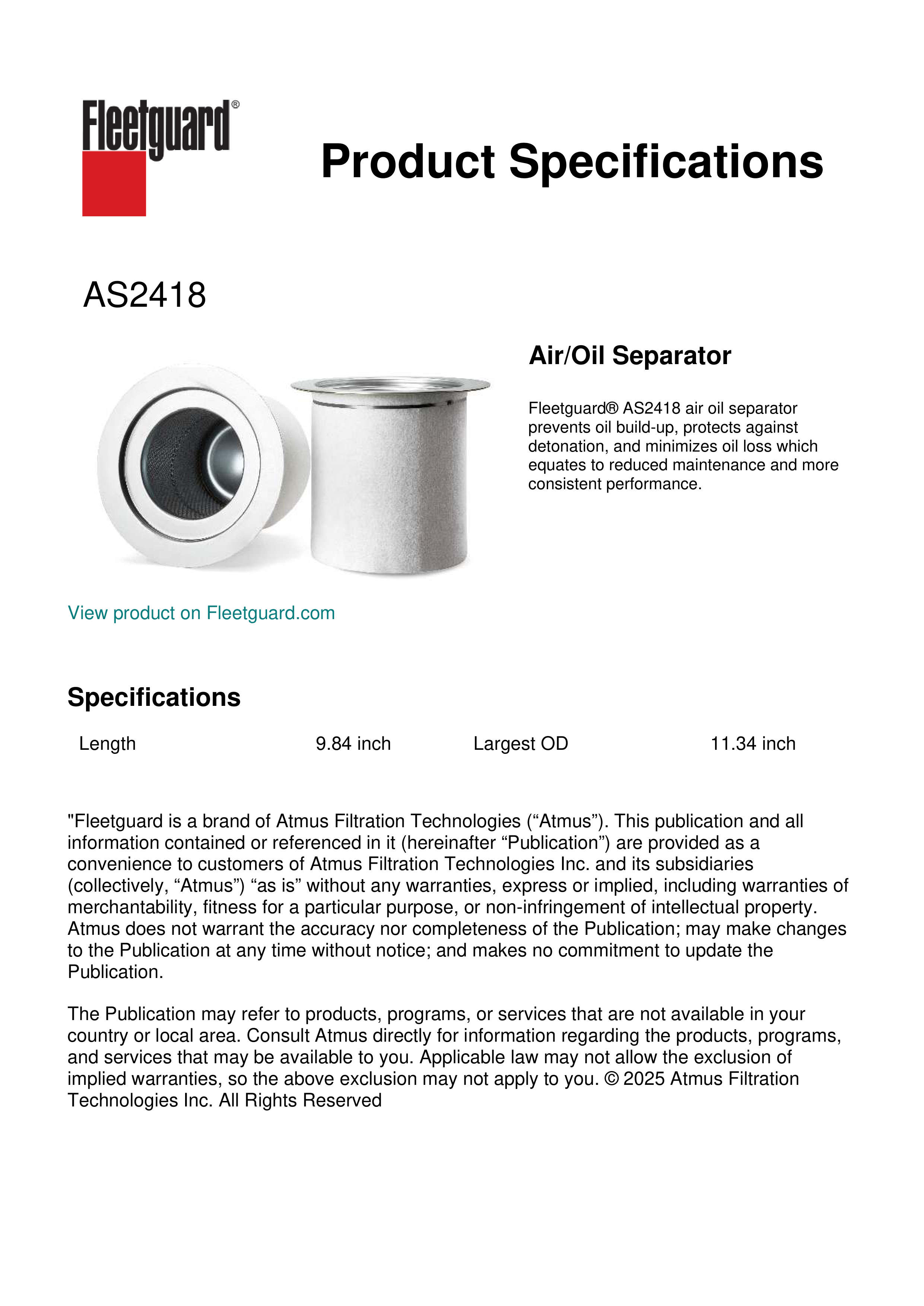 Fleetguard® AS2418 air oil separator prevents oil build-up, protects against detonation, and minimizes oil loss which equates to reduced maintenance and more consistent performance.Specification