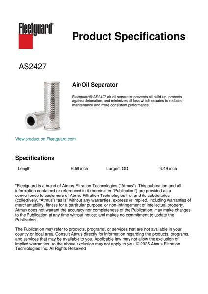 Fleetguard® AS2427 air oil separator prevents oil build-up, protects against detonation, and minimizes oil loss which equates to reduced maintenance and more consistent performance.Specification