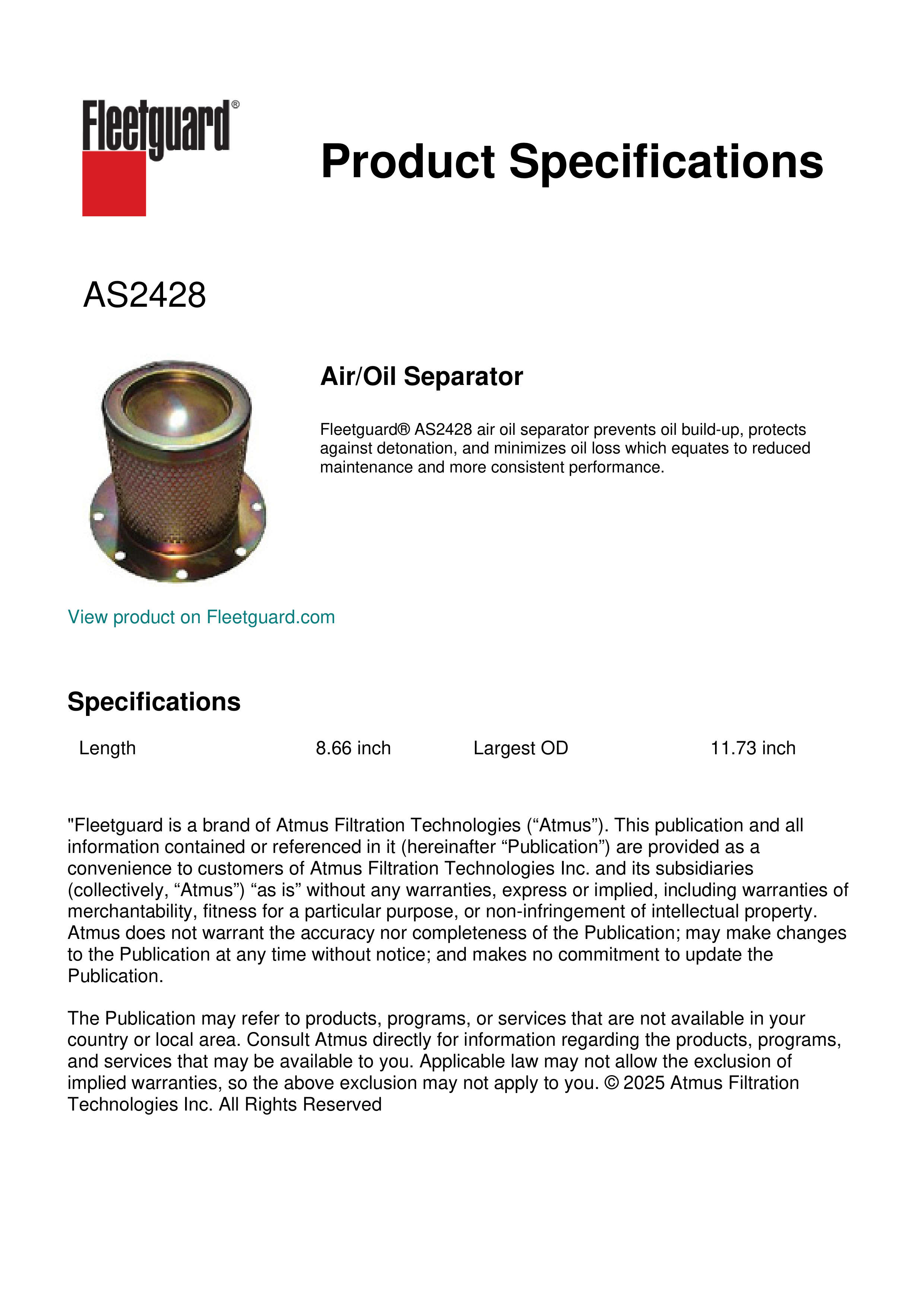 Fleetguard® AS2428 air oil separator prevents oil build-up, protects against detonation, and minimizes oil loss which equates to reduced maintenance and more consistent performance.Specification