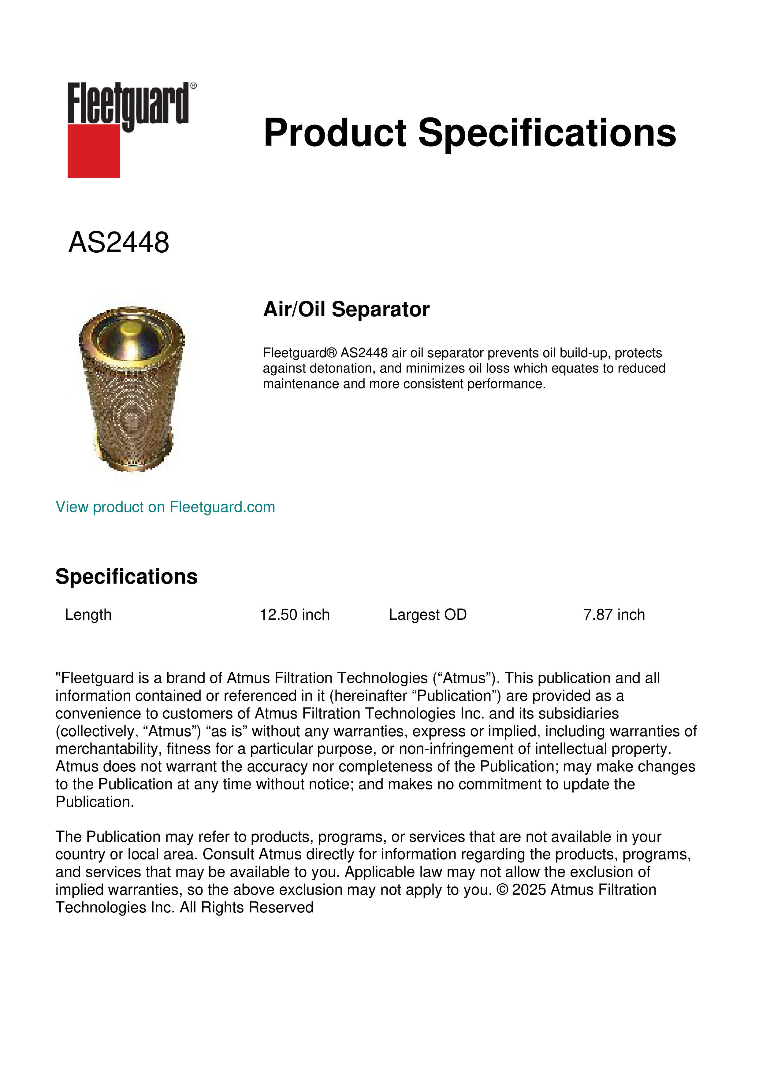 Fleetguard® AS2448 air oil separator prevents oil build-up, protects against detonation, and minimizes oil loss which equates to reduced maintenance and more consistent performance.Specification