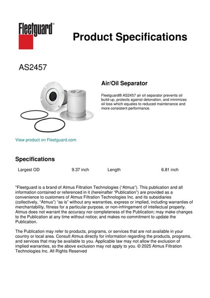 Fleetguard® AS2457 air oil separator prevents oil build-up, protects against detonation, and minimizes oil loss which equates to reduced maintenance and more consistent performance.Specification