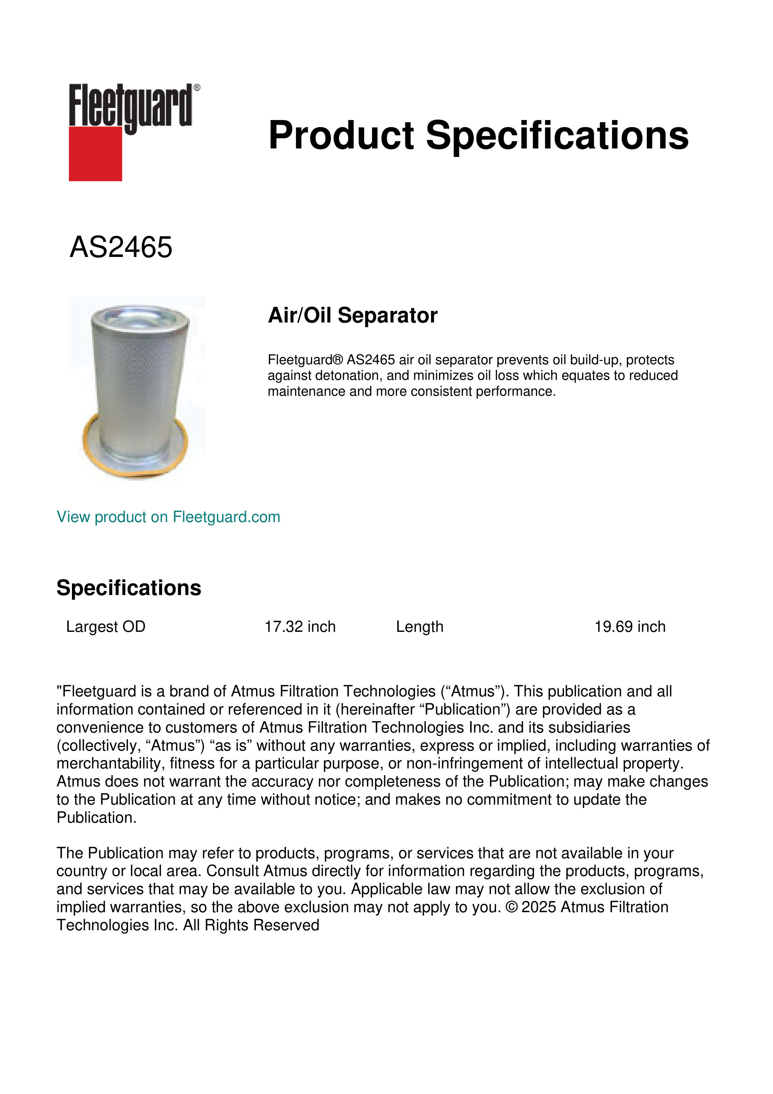 Fleetguard® AS2465 air oil separator prevents oil build-up, protects against detonation, and minimizes oil loss which equates to reduced maintenance and more consistent performance.Specification
