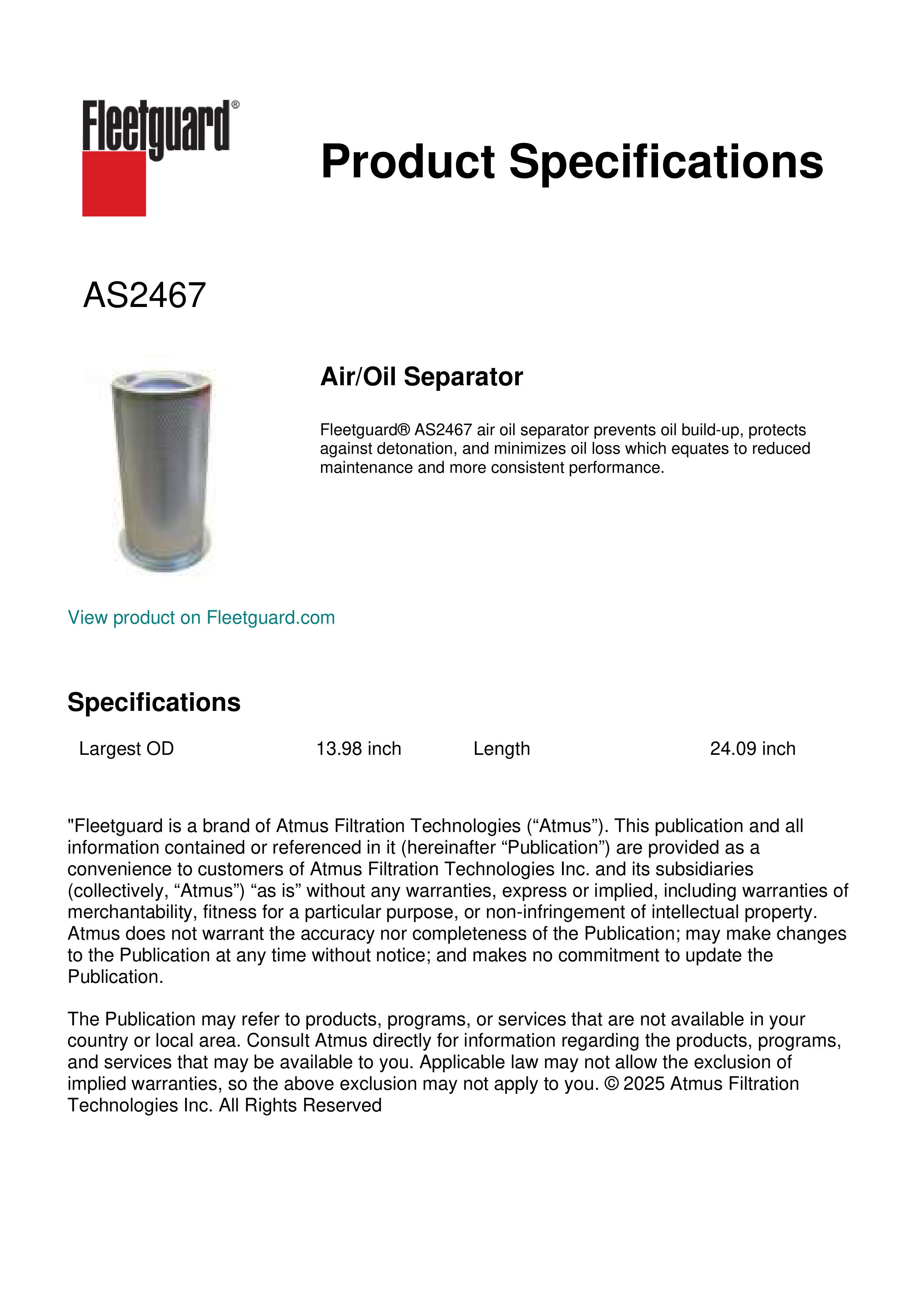 Fleetguard® AS2467 air oil separator prevents oil build-up, protects against detonation, and minimizes oil loss which equates to reduced maintenance and more consistent performance.Specification