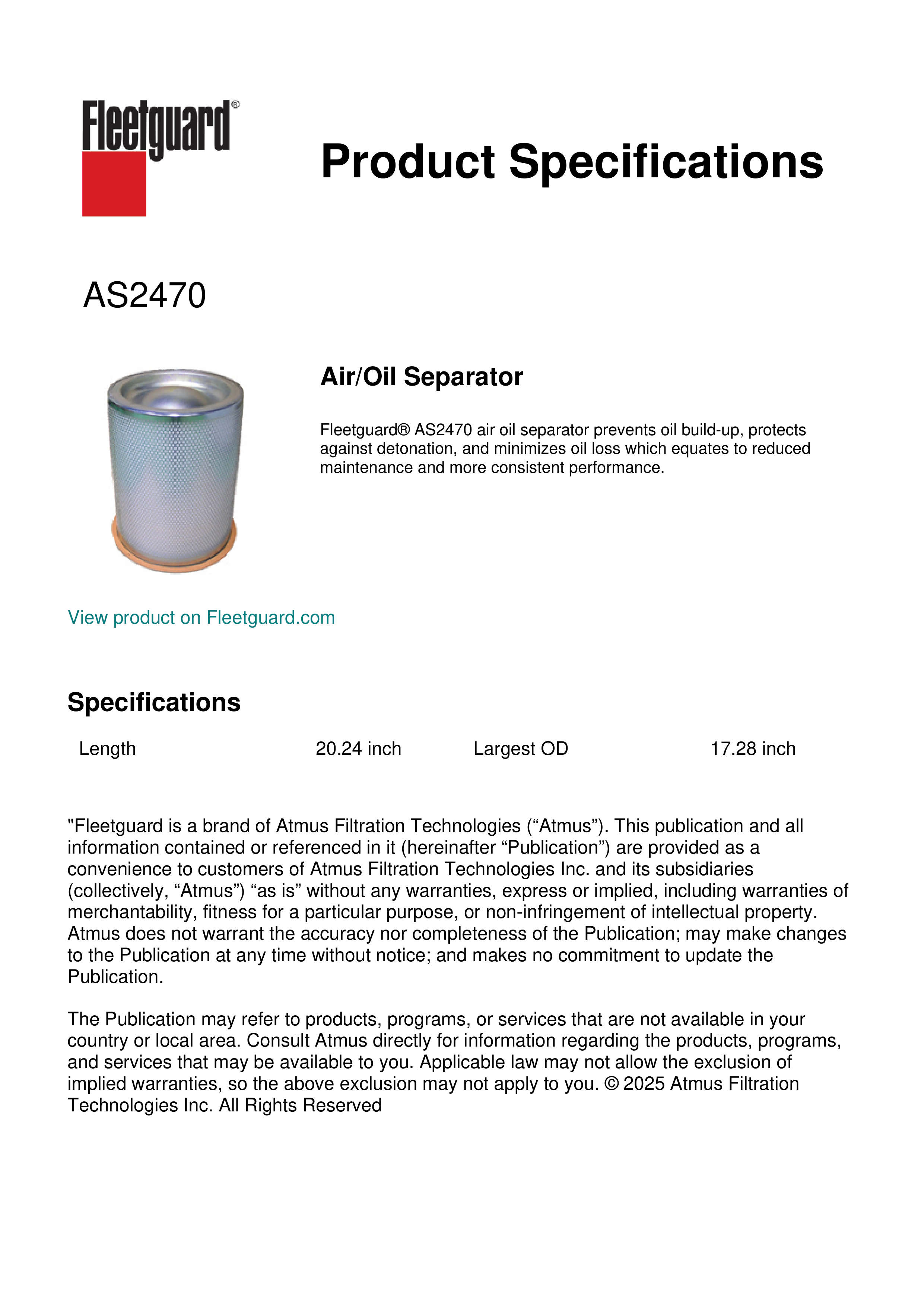 Fleetguard® AS2470 air oil separator prevents oil build-up, protects against detonation, and minimizes oil loss which equates to reduced maintenance and more consistent performance.Specification