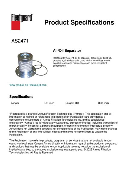 Fleetguard® AS2471 air oil separator prevents oil build-up, protects against detonation, and minimizes oil loss which equates to reduced maintenance and more consistent performance.Specification
