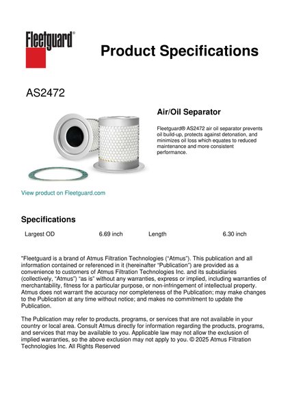 Fleetguard® AS2472 air oil separator prevents oil build-up, protects against detonation, and minimizes oil loss which equates to reduced maintenance and more consistent performance.Specification
