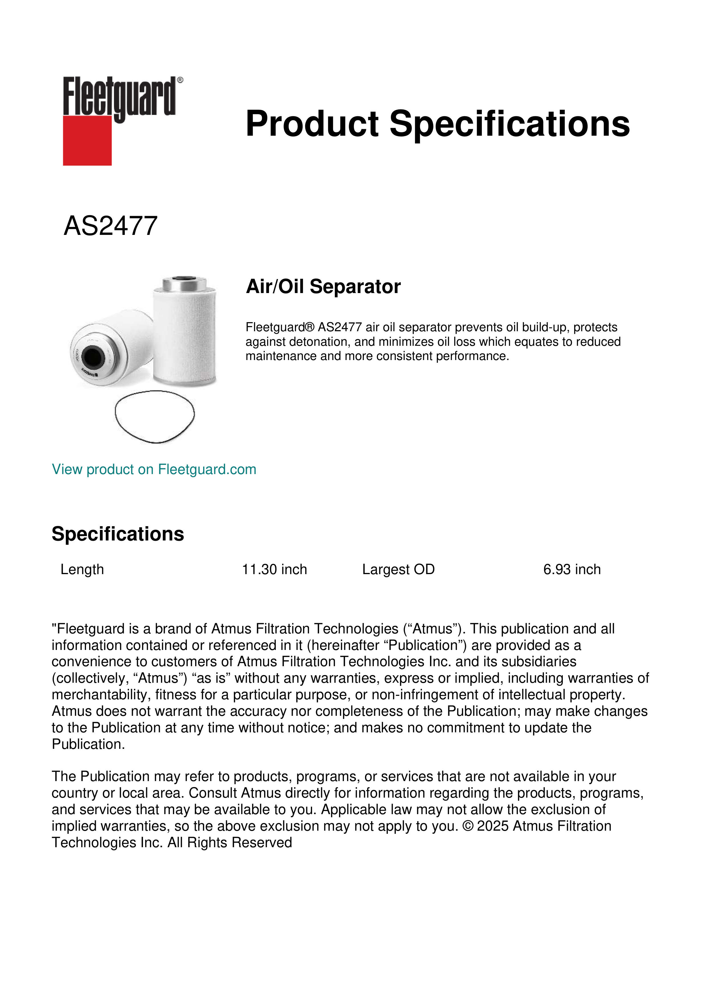 Fleetguard® AS2477 air oil separator prevents oil build-up, protects against detonation, and minimizes oil loss which equates to reduced maintenance and more consistent performance.Specification