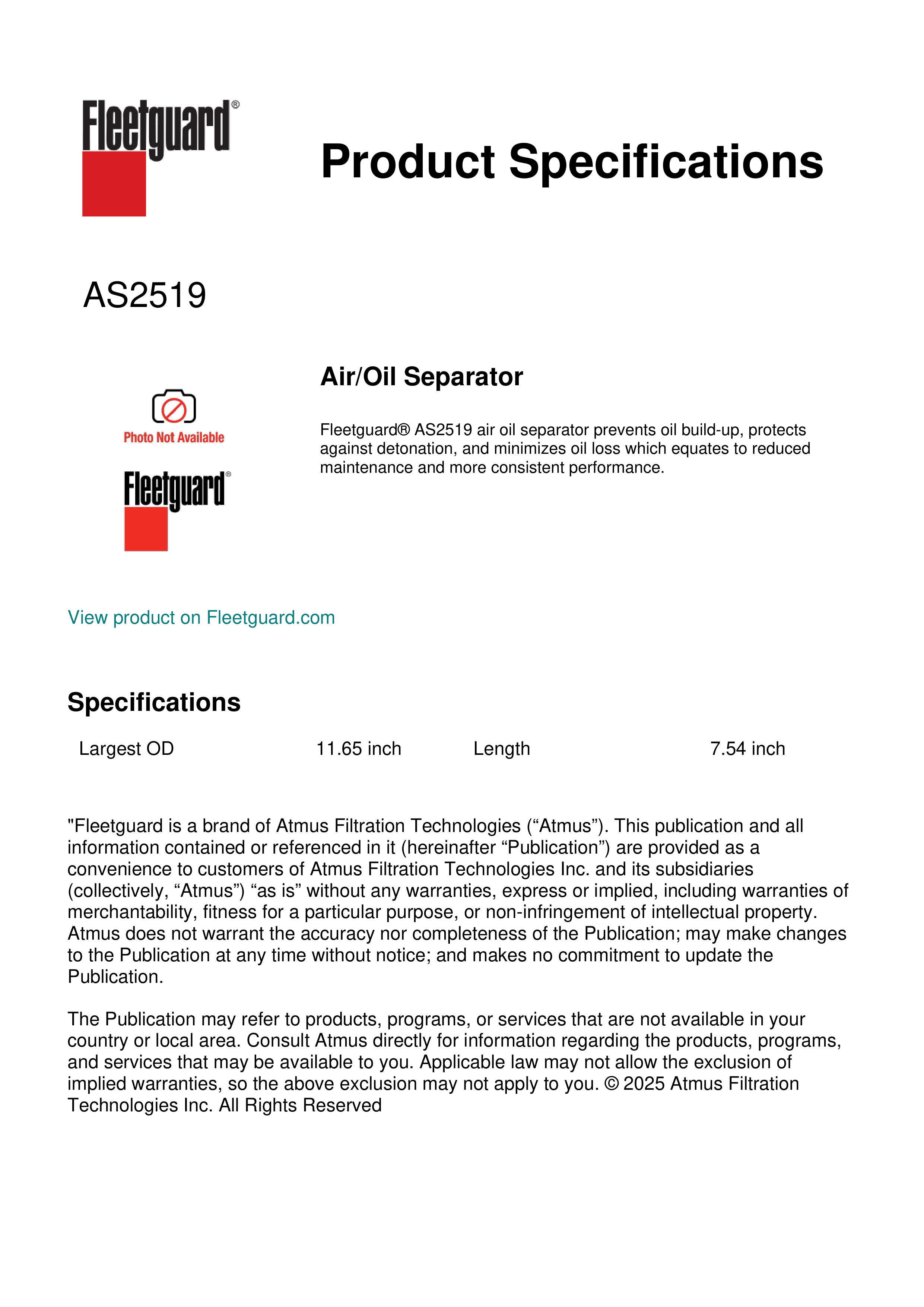 Fleetguard® AS2519 air oil separator prevents oil build-up, protects against detonation, and minimizes oil loss which equates to reduced maintenance and more consistent performance.Specification