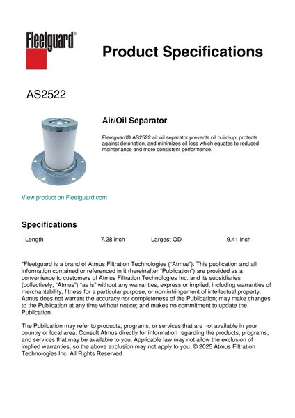 Fleetguard® AS2522 air oil separator prevents oil build-up, protects against detonation, and minimizes oil loss which equates to reduced maintenance and more consistent performance.Specification