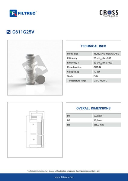Engineered with their high performance media and a durable design, the C611G25V provides reliable and consistent performance over its lifespan, even in harsh operating environments. When you order from FilterFinder, you can trust that you are getting a reliable and high-quality replacement filter that will keep your system running smoothly.