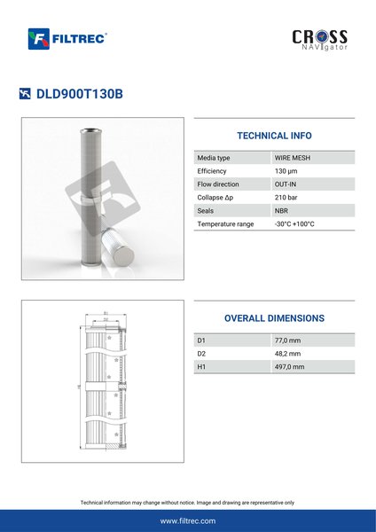 Genuine Filtrec DLD900T130B. This Filtrec element is designed to meet or exceed the quality and performance of brand OEM’s ensuring superior filtration performance and long-lasting durability.