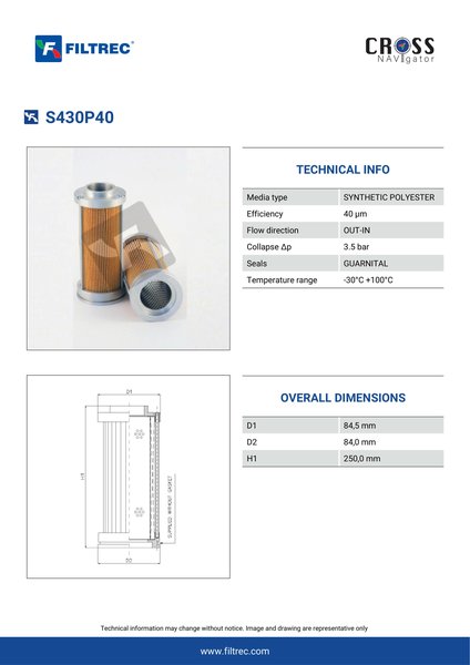 Genuine Filtrec S430P40. This Filtrec element is designed to meet or exceed the quality and performance of brand OEM’s ensuring superior filtration performance and long-lasting durability.