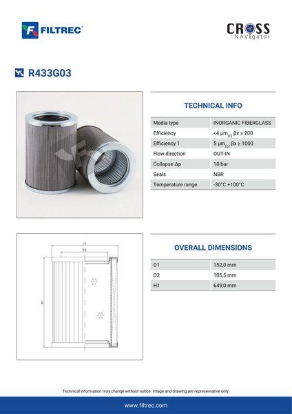 Genuine Filtrec R433G03. This Filtrec element is designed to meet or exceed the quality and performance of brand OEM’s ensuring superior filtration performance and long-lasting durability.